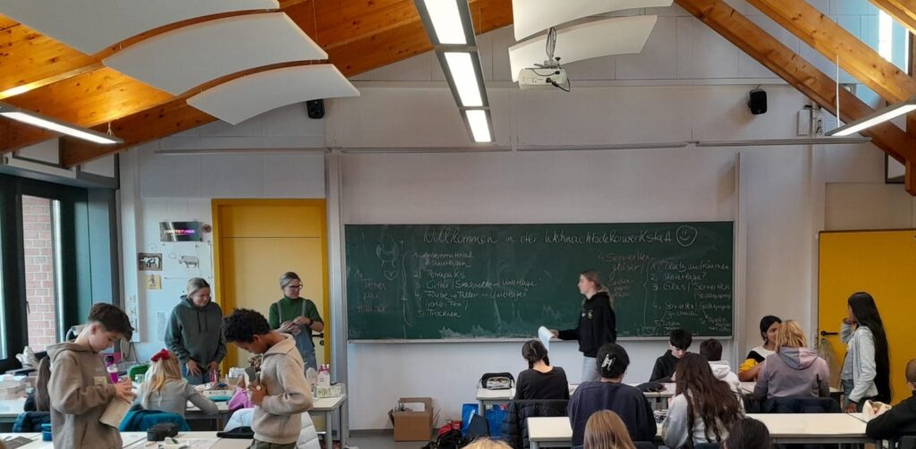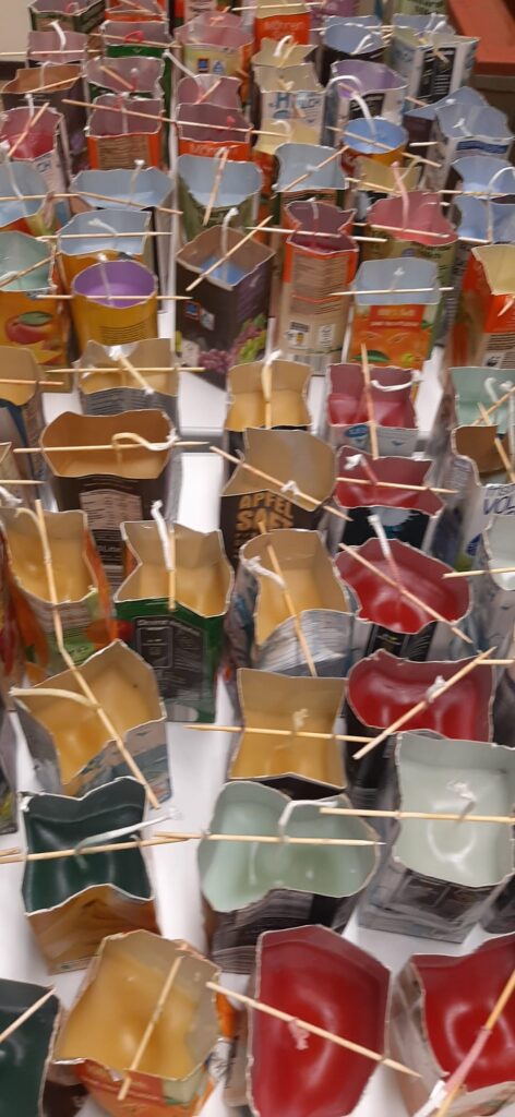 So haben wir kistenweise Kerzen hergestellt. Die einen stellten lieber die Tetrapak-Umrisse her, die anderen halfen beim Wachsschmelzen. Wir waren ein wirklich gutes Team! Auch die Kerzen werden am 17.12.2025 auf dem Weihnachtsmarkt des Emmys verkauft. Es lohnt sich wirklich, welche zu kaufen. Einige duften sogar, weil manche Wachsreste zuvor Duftkerzen waren. Vielleicht willst ja auch du etwas für die Umwelt tun? Mach doch auch mal solche Knautschkerzen oder spende uns Wachs, sodass wir welche machen können!