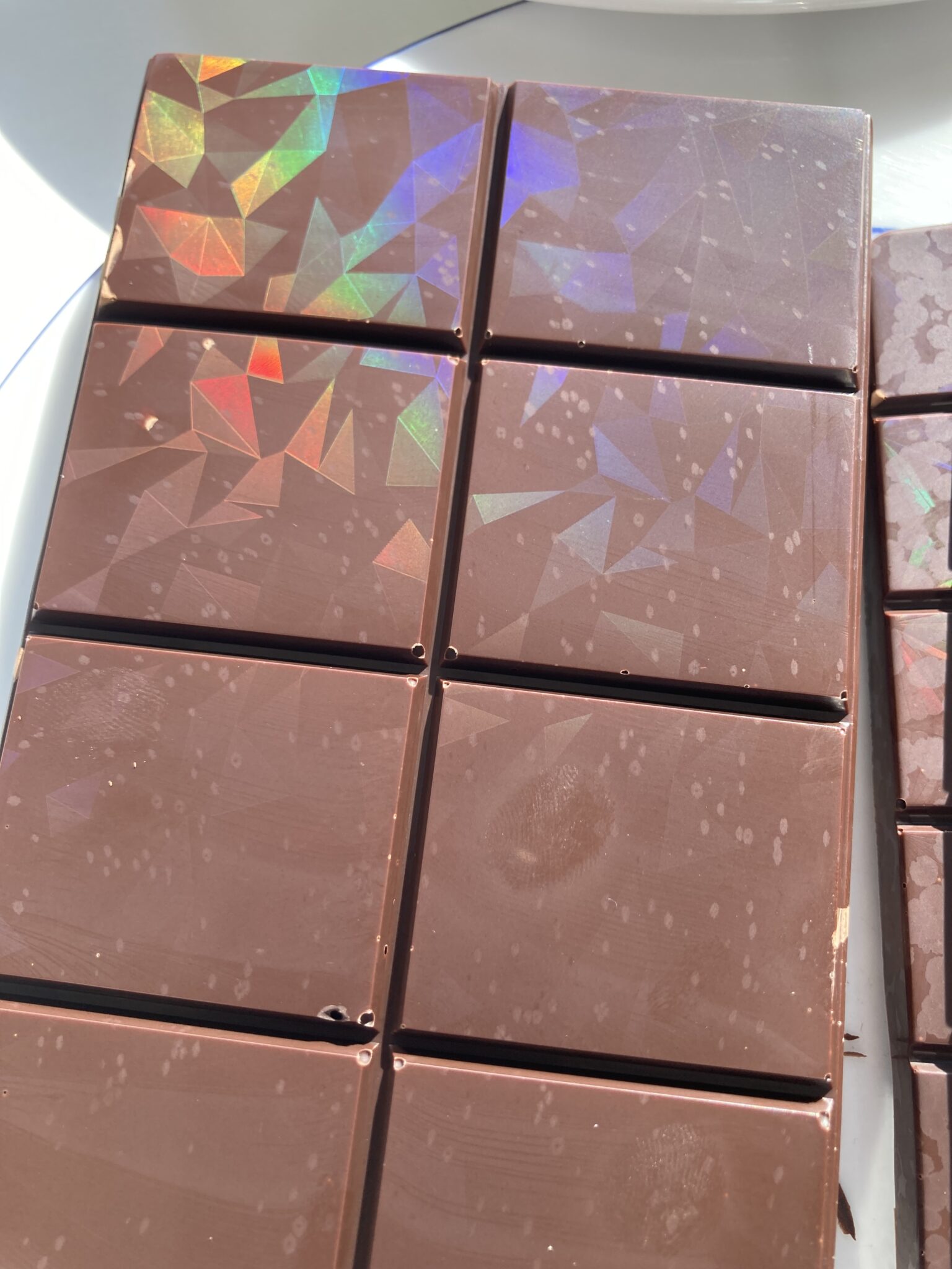 Dafür haben wir dunkle Schokolade geschmolzen und in Formen gegossen, die aus einer speziellen Struktur aufgebaut sind, die die Wellenlängen des Lichtes auf besondere Weise reflektiert. Und unsere Schokolade schillert in allen Regenbogenfarben, ohne dass wir irgendein Farbpigment hinzugegeben haben. Toll – und sehr lecker ist sie auch!