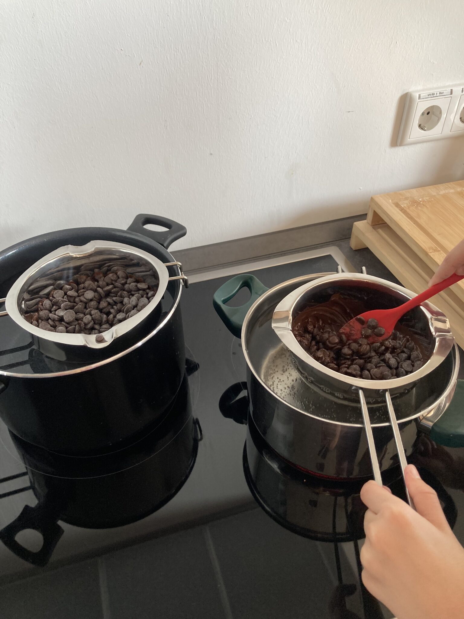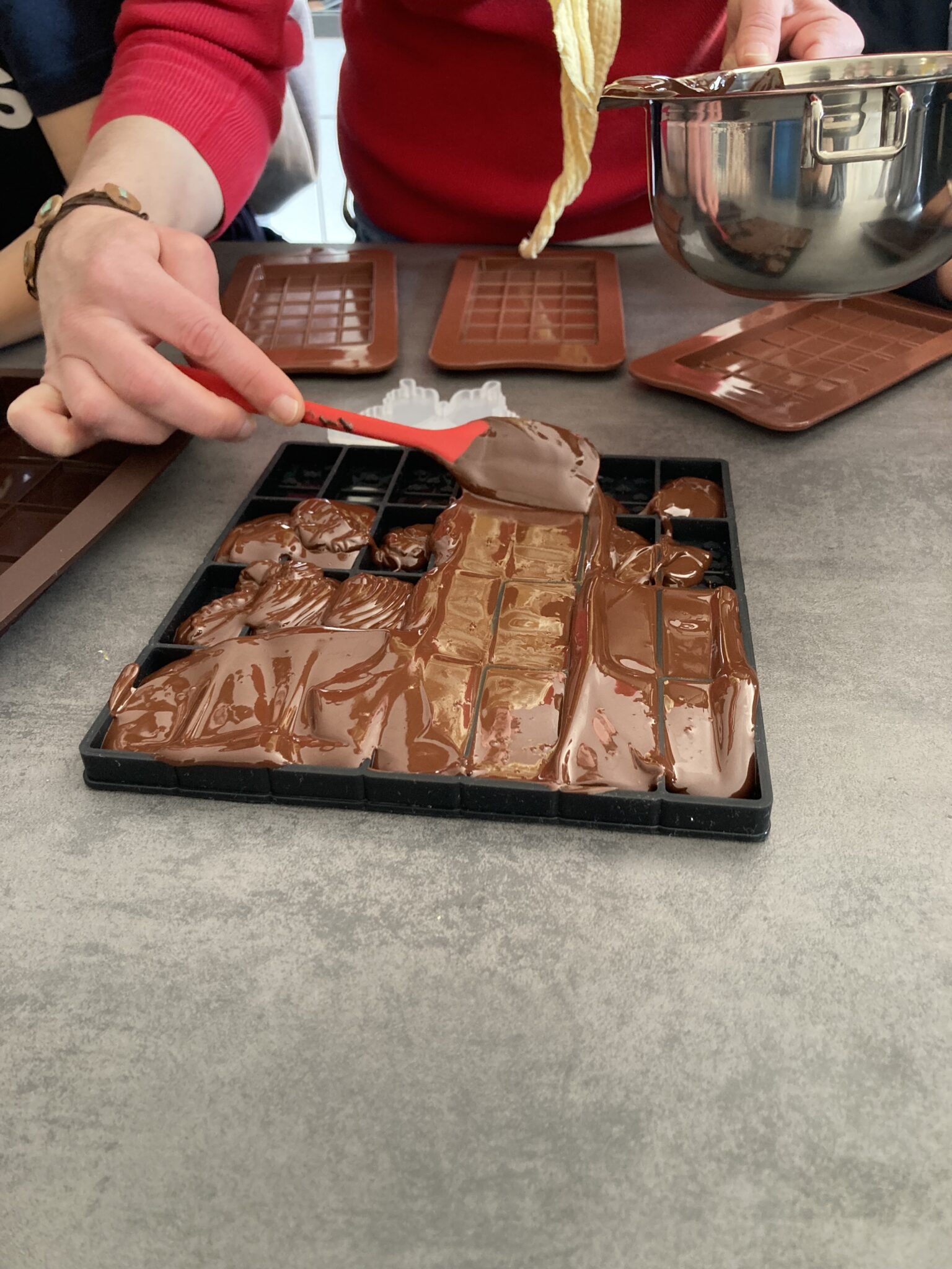 Nach unserem Besuch von Prof. Vogel, der uns über Strukturfarben berichtet hat und wie diese entstehen, wollten wir das natürlich ausprobieren und haben Schokolade selber gegossen.