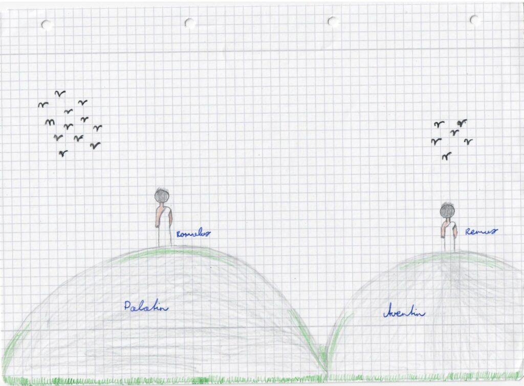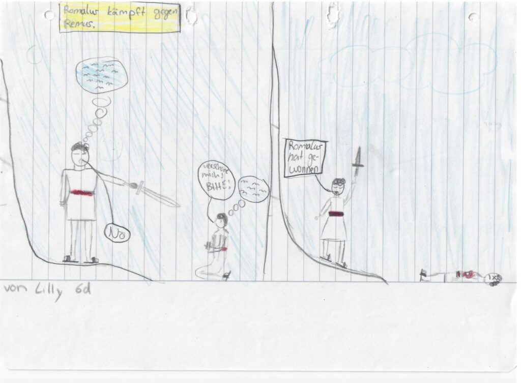 Anschließend haben wir die Geschichte von Romulus und Remus in eigenen Bildern verarbeitet. Genau diese Einblicke in die Antike und ihre Geschichten und die Möglichkeit, darüber zu sprechen und sie in unterschiedlichen Formen zu rezipieren, macht uns so viel Spaß.