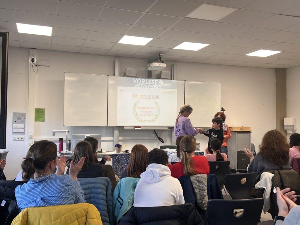 Der Stadtentscheid zur Wahl des besten Vorlesers Erlangens fand am 24.02.2026 an unserer Schule statt. Eingeladen waren die Schulsieger der Erlanger Gymnasien sowie der Werner-von Siemens-Realschule und der Montessori Schule Erlangen. Nach der Begrüßung durch die stellvertretende Schulleiterin Frau Berthold und durch die Organisatorinnen Frau Giese und Frau Hinterstein durften die Schülerinnen und Schüler zunächst einen selbstgewählten Textausschnitt, der vorher zuhause eingeübt wurde, vorlesen. Die vierköpfige Jury, bestehend aus Frau Jungnitz von der Buchhandlung Witthuhn, Frau Knabe von der Grundschule Eltersdorf, Frau Herold von der Otfried-Preußler-Schule und Frau Rausch vom Kulturamt der Stadt Erlangen, bewertete dabei die Auswahl der Textstelle, die Lesetechnik und Interpretation. Dem Publikum wurde beim Vorlesen ein Einblick in die vielfältige Jugendliteratur geboten. Nach einer kurzen Pause waren die Teilnehmer und Teilnehmerinnen gefordert, einen Fremdtext spontan möglichst gekonnt vorzulesen. Diesen bewältigten alle mit Bravour, sodass die Entscheidung für die Jury denkbar schwer war. Letztlich setzte sich Louisa Werner vom Marie-Therese-Gymnasium gegen die Konkurrenz durch und wurde wegen einer hervorragenden Darstellung der Dialoge und einem souveränen Umgang mit dem Fremdtext zur Siegerin gekürt. Milano Hofmann unserer Schule freute sich über den zweiten Platz. Alle Teilnehmerinnen und Teilnehmer erhielten als Erinnerung ein Buch, mit dem sie ihre Lesefreude fortsetzen können.