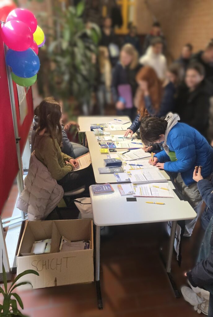 Mit diesen beiden Fällen – und sechs weiteren – wurden unsere Schülerinnen und Schüler in den Dezemberwochen vor allem in den Pausen konfrontiert. Sie konnten sich informieren und Unterschriften leisten, die anschließend gesammelt an Amnesty International weitergeleitet wurden. Von dort aus wurden sie gebündelt an staatliche Stellen, Richter:innen und Politiker:innen gesendet, um deutlich zu machen, dass es eine Öffentlichkeit gibt, die faire Gerichtsverfahren und die Einhaltung von Menschenrechtsstandards einfordert.